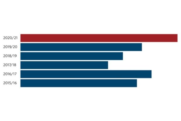 Antallet af nytilmeldte ledige fra 15. december 2020 til 2. februar 2021 har kun været beskedent højere end samme periode de foregående fem år. Kilde: AE på baggrund af Beskæftigelsesministeriet. Grafik: AE
