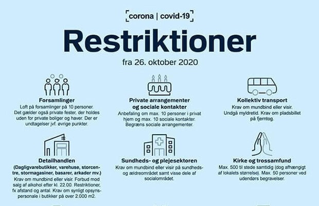 Åbn artiklen og få det samlede overblik over de opdaterede Covid-19 restriktioner gældende fra 26. oktober i Danmark.