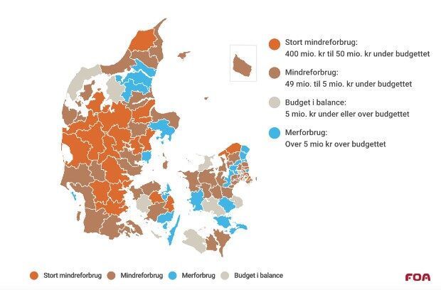 I 2020 havde kommunerne et samlet underforbrug på 2,9 milliarder kroner. FOA har beregnet, at det kommunerne underforbrugte i 2020 eksempelvis, svarer til en times ekstra rengøring om ugen til alle 122.500 i hjemmeplejen eller gratis idræt og en computer til alle 715.000 skoleelever.